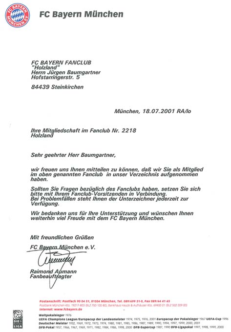 Am 18.07.2001 wurden wir dann offiziell beim FC Bayern als Fanclub aufgenommen und aufgeführt.
